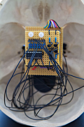 The Memento Mori installation consists of a 4 digit LED display, which is mounted between the teeth of a casted human skull and connected to a highly accurate rubidium atomic clock. The display visualizes the passage of time by repeatedly counting down one second in millisecond-steps (from 1.000 to .001).